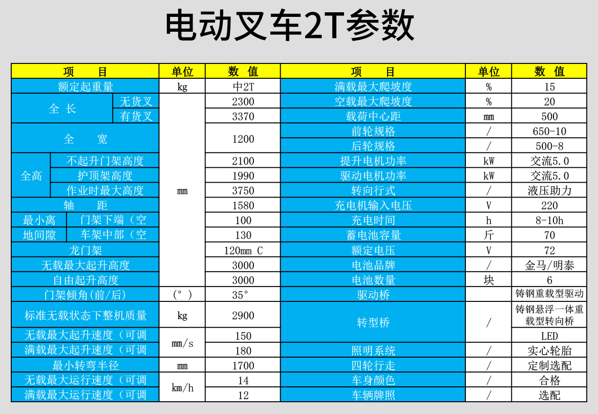 | 全長 | 無貨叉 | mm | 2300 | 空載最大爬坡度 | % | 20 | ||